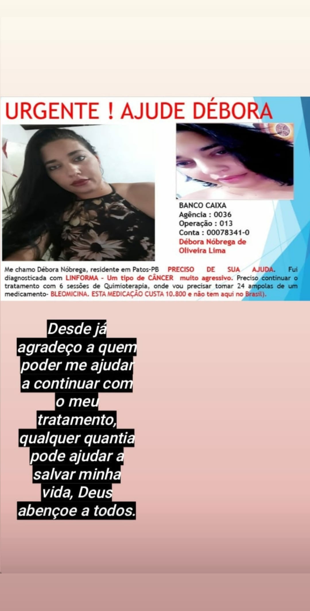 As pessoas interessadas em ajudar a Débora Nóbrega realizar o tratamento, podem depositar qualquer valor na seguinte conta: