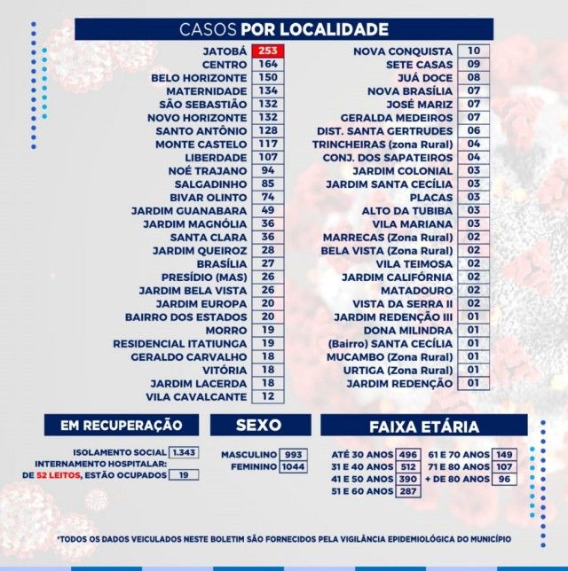 Foram registrados 51 novos casos de coronavírus nas últimas 24h, e as localidades com o maior número de registros foram, Jatobá, com 9 casos a mais, Belo Horizonte e Maternidade, com 6 casos a mais cada um, e Centro com 5 casos a mais.