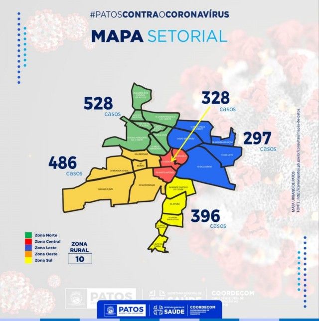 Ainda de acordo com os números desta quarta, a Zona Norte de Patos segue como a região com o maior índice de casos confirmados para o Covid-19, com 528 casos. Na separação por localidades, o Jatobá (bairro da Zona Sul) lidera com o registro de 256 casos.
