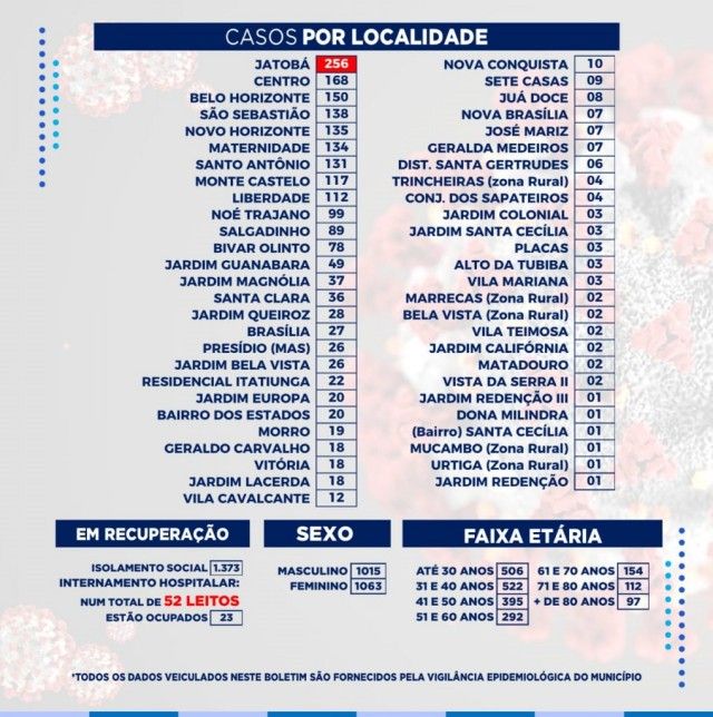Foram registrados 41 novos casos de coronavírus nas últimas 24h, e as localidades com o maior número de registros foram, São Sebastião, com 6 casos a mais, Liberdade e Noé Trajano, com 5 casos a mais cada um, e Bivar Olinto, Centro e Salgadinho, com 4 casos a mais cada um.