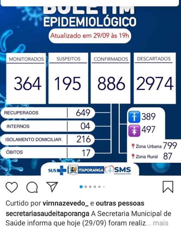 O município de Itaporanga, a Rainha do Vale do Piancó, preocupa no que tange à Covid-19. Foram registrados mais casos do Coronavírus e o município atingiu uma marca negativa de mais 885 pessoas infectadas com à Covid-19, segundo dados da Secretária de Saúde do Município , divulgado nesta terça-feira 29/09. Já são 17 mortes por contaminação da doença, até a última terça-feira (29), de acordo com informações da secretaria municipal de saúde.