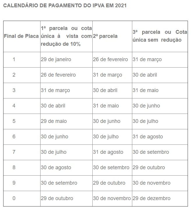Nas regras para pagamento do tributo como, por exemplo, o desconto de 10% na cota única à vista, parcelamento em até três vezes e o calendário estendido em 10 meses para pagamento, permanecerão mais uma vez inalterados para o exercício de 2021, conforme o número da placa final do veículo.