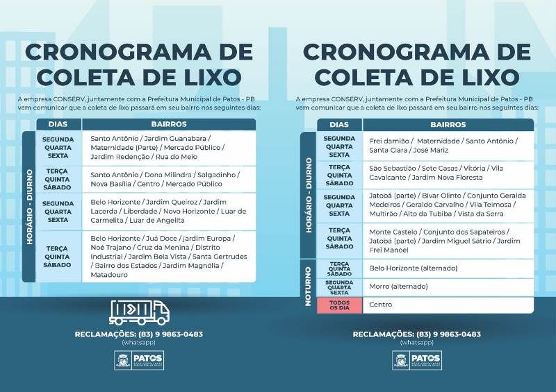 A Prefeitura de Patos, por meio da Secretaria de Serviços Públicos e da Conserv, empresa responsável pela coleta domiciliar de lixo na cidade, informa à população o calendário contendo os dias de recolhimento do lixo doméstico nos bairros e centro da cidade.