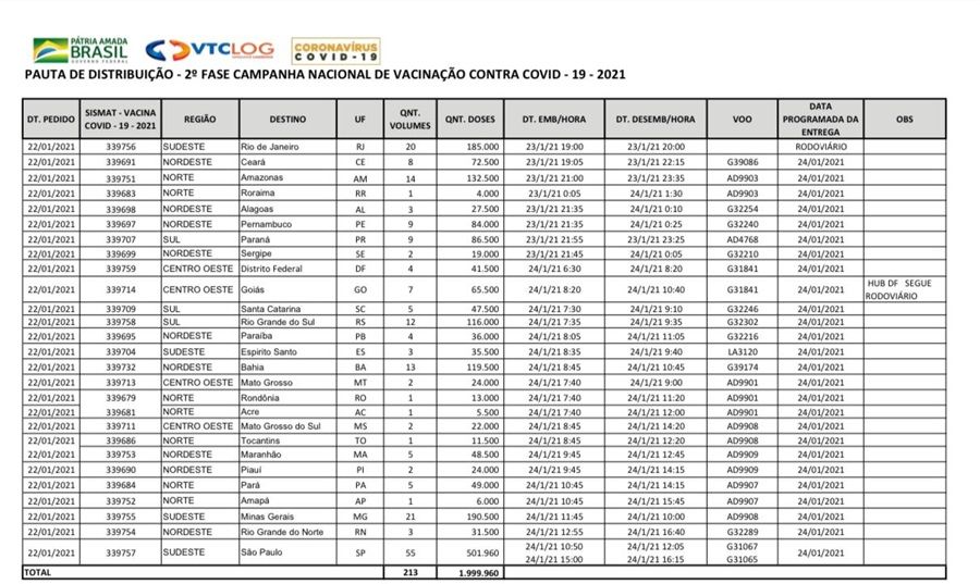 Segundo expectativas do Ministério da Saúde, a distribuição dos lotes para os estados começa ainda na tarde deste sábado. Conforme disse o ministro da Saúde, Eduardo Pazuello, a vacinação está apenas no início no Brasil. Os lotes da vacina de Oxford devem seguir com prioridade para o Amazonas, estado que vive caos na saúde por causa do elevado número de pessoas com o vírus.