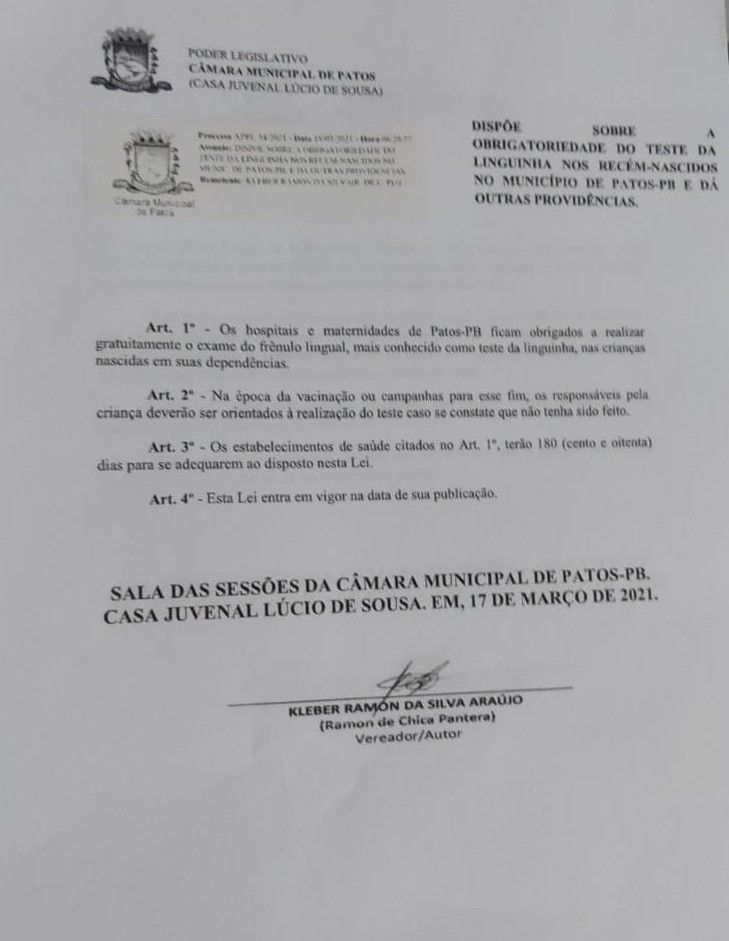 O vereador Ramon de Chica Pantera apresentou na sessão ordinária desta quinta-feira, 18, na Câmara Municipal de Patos, um projeto de lei instituindo a obrigatoriedade do teste da