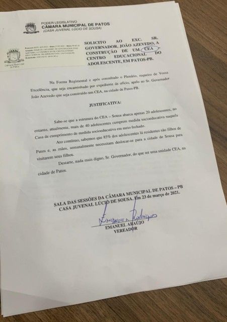Em outro requerimento apresentado, Emano Araújo pediu a construção do Centro Educacional do Adolescente, existente atualmente na cidade de Sousa, com capacitade para abrigar apenas 20 adolescentes cumprindo medidas socioeducativas.