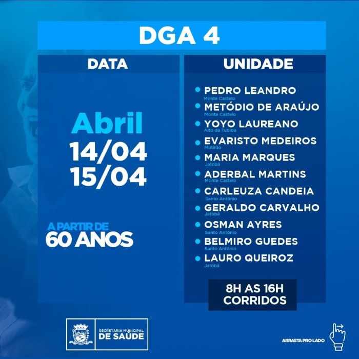 De acordo com o prefeito, a imunização dessa faixa etária terá início no próximo dia 8 de abril, e segue até dia 17, com dois dias de vacinação para cada DGA, ou cada área da cidade.