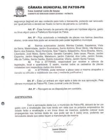 Um projeto de Lei de autoria do vereador Josmá Oliveira, Patriota, visando sinalizar todas as ruas de Patos com os respectivos nomes adotados, aprovado por unanimidade pelos vereadores do município, simplesmente, a exemplo de outros projetos de lei oriundos da