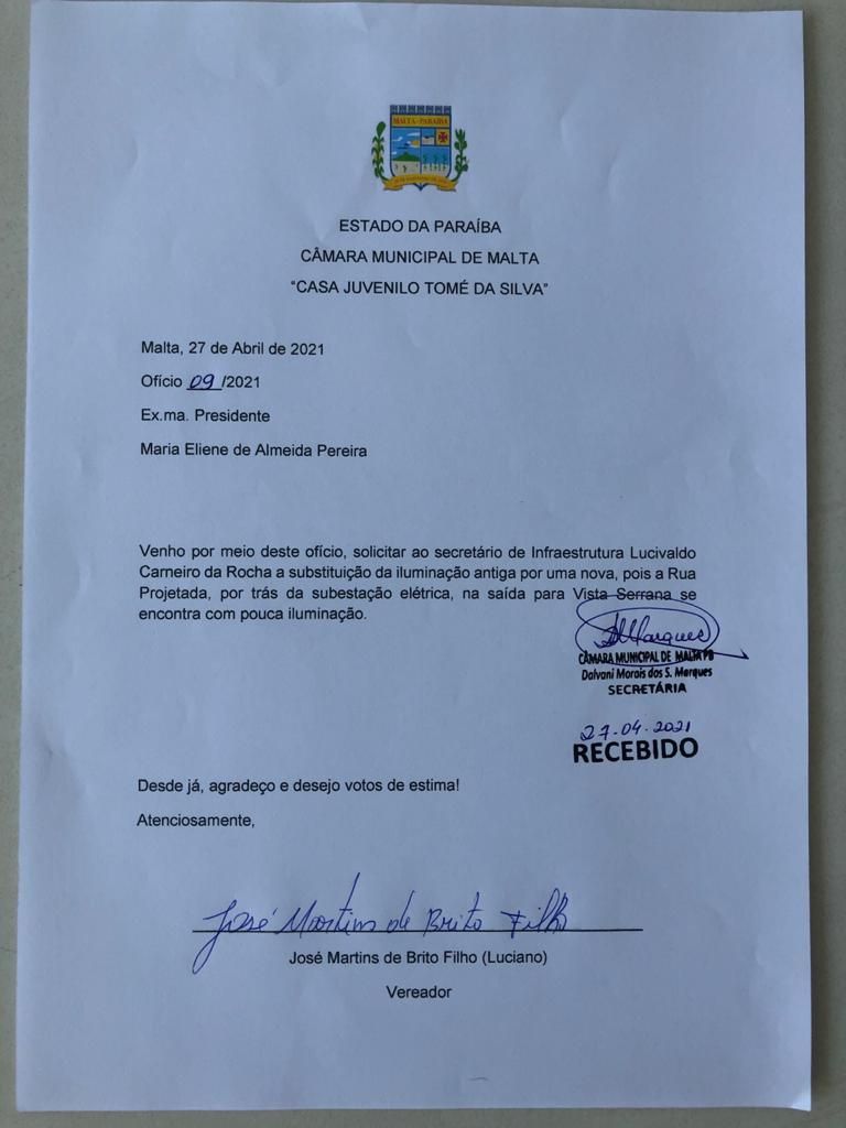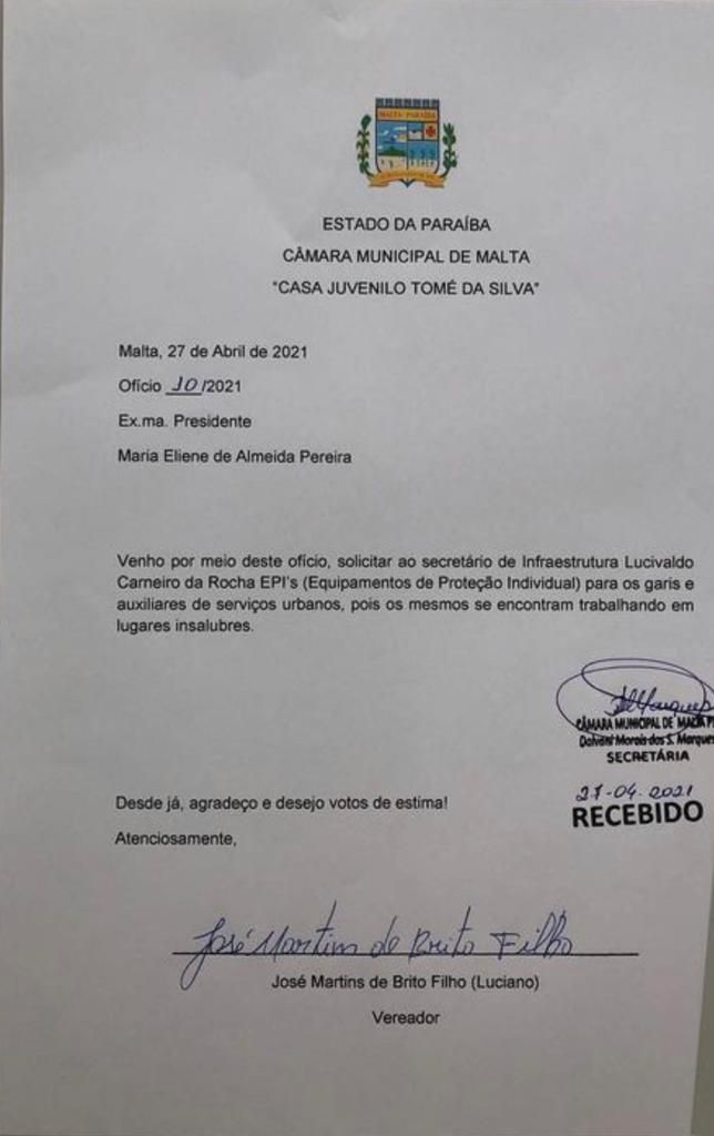 O ofício do parlamentar foi encaminhado no final aí do mês de abril, a presidente da Câmara Municipal de Malta, Maria Eliene Pereira, e conta com o apoio da também vereadora do PL, Nivailda, que endoçou o seu apoio nas sessões ordinárias do legislativo maltense.