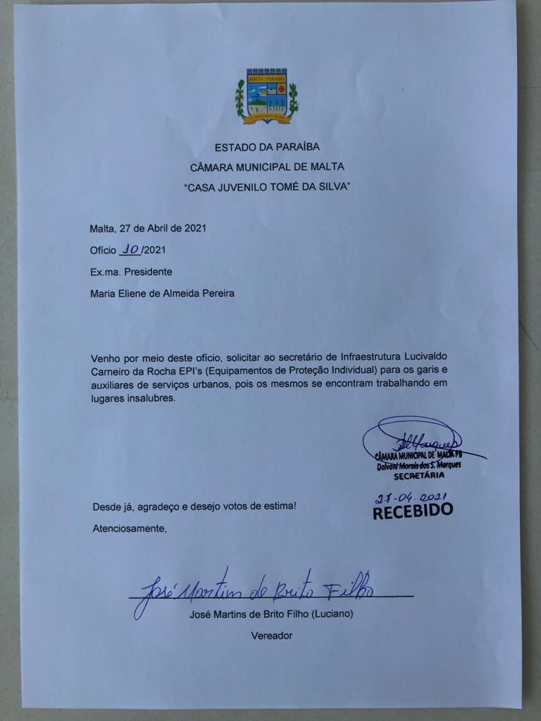 O vereador Luciano Brito (PL), está cobrando da gestão municipal de Malta, a entrega de equipamentos de proteção individual-EPIs, para os garis e auxiliares de serviços que trabalham