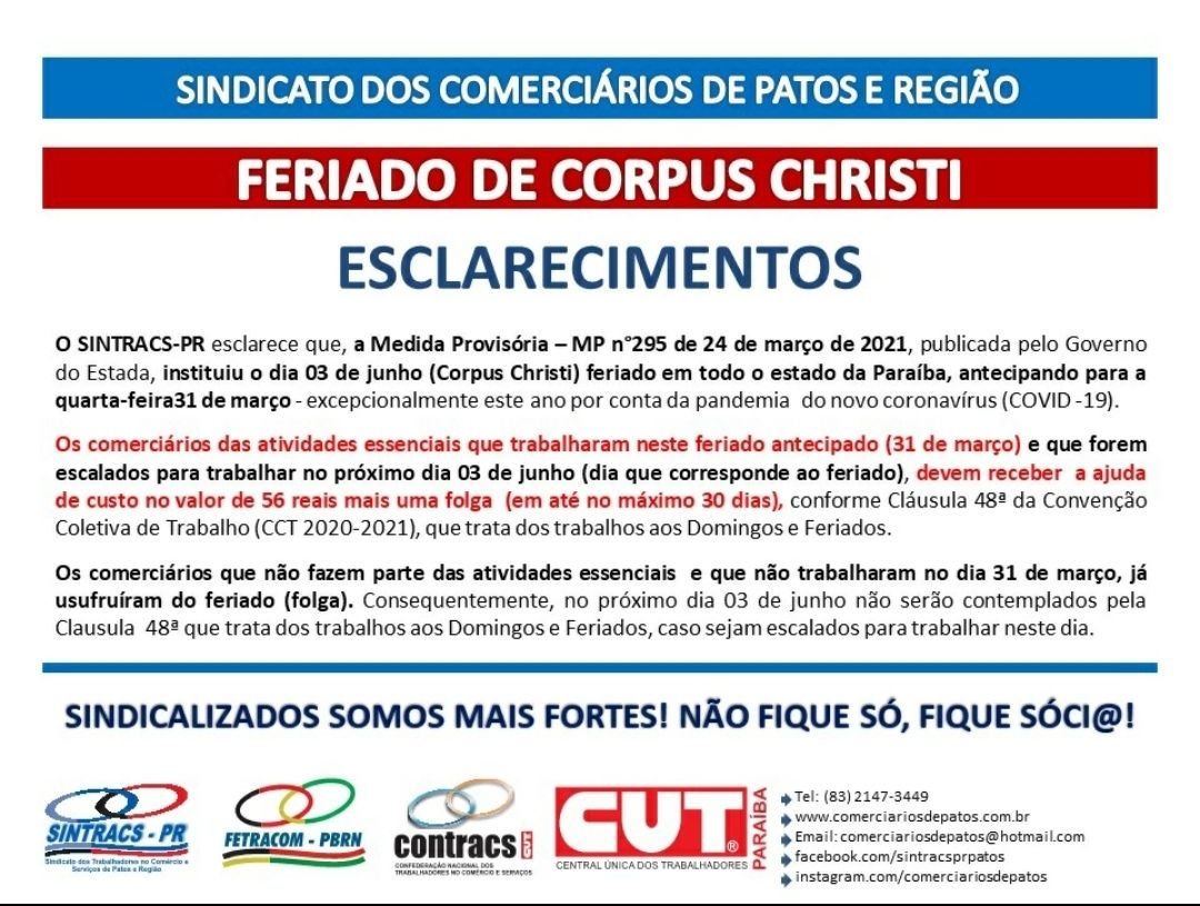 Segundo o presidente do Sindicato dos Comérciários de Patos, Everaldo Lima, a abertura já é prevista por conta da antecipação do feriado na Medida Provisória 295/2021, assinada pelo governador João Azevêdo no mês de março, que incluiu o feriado religioso.