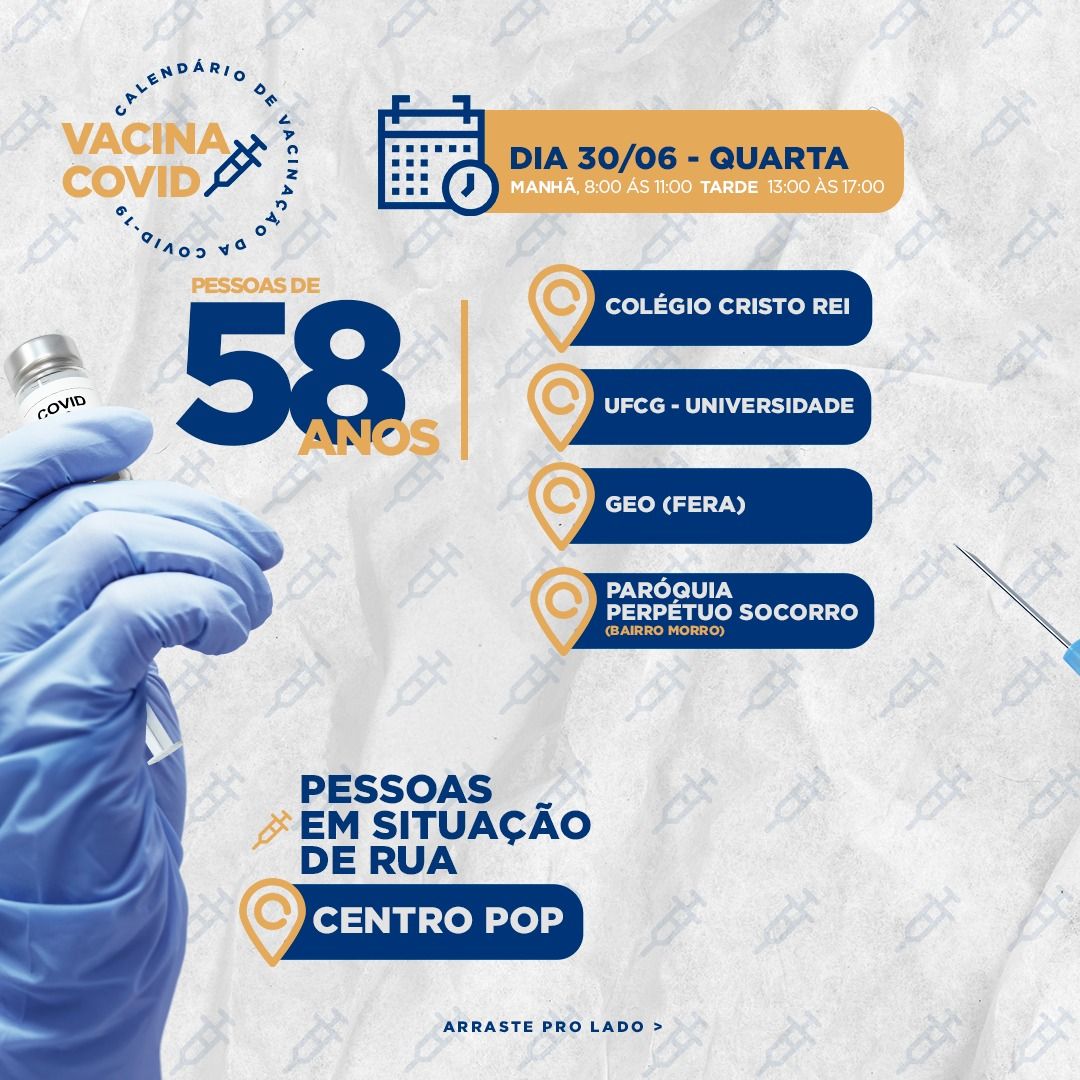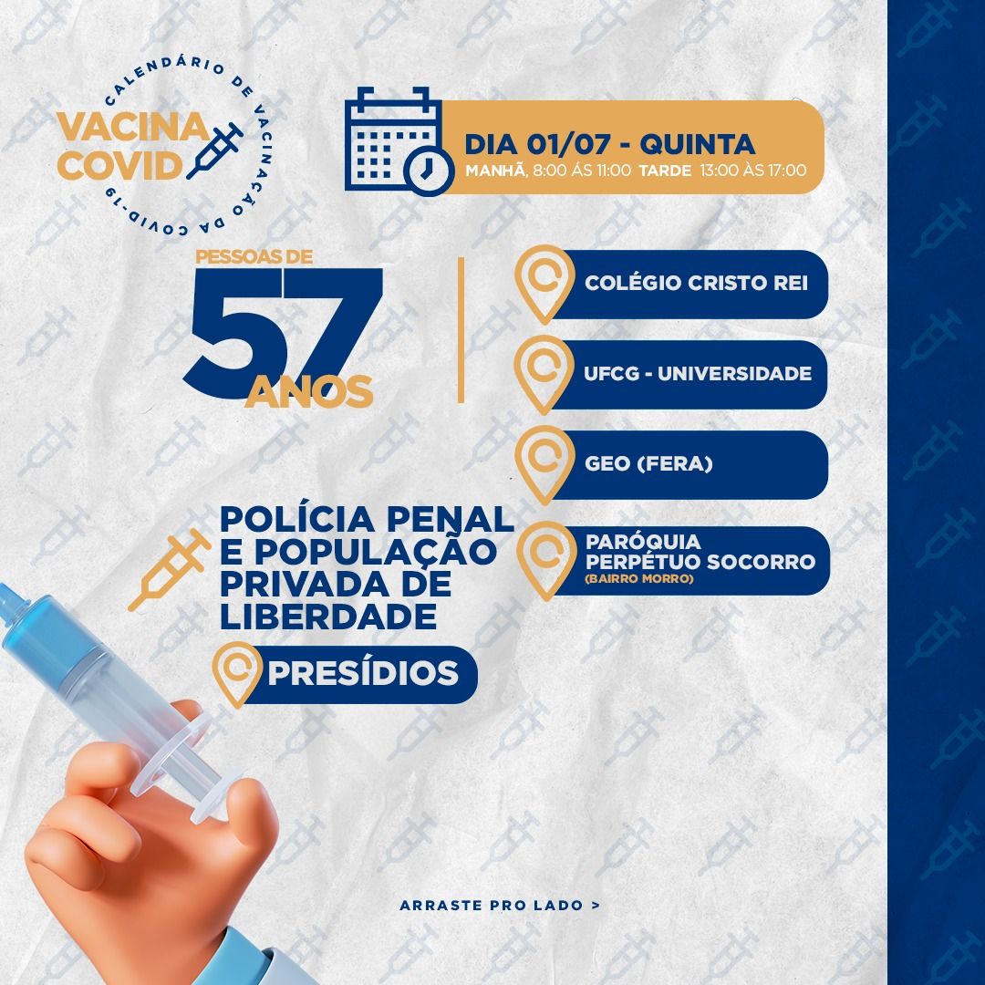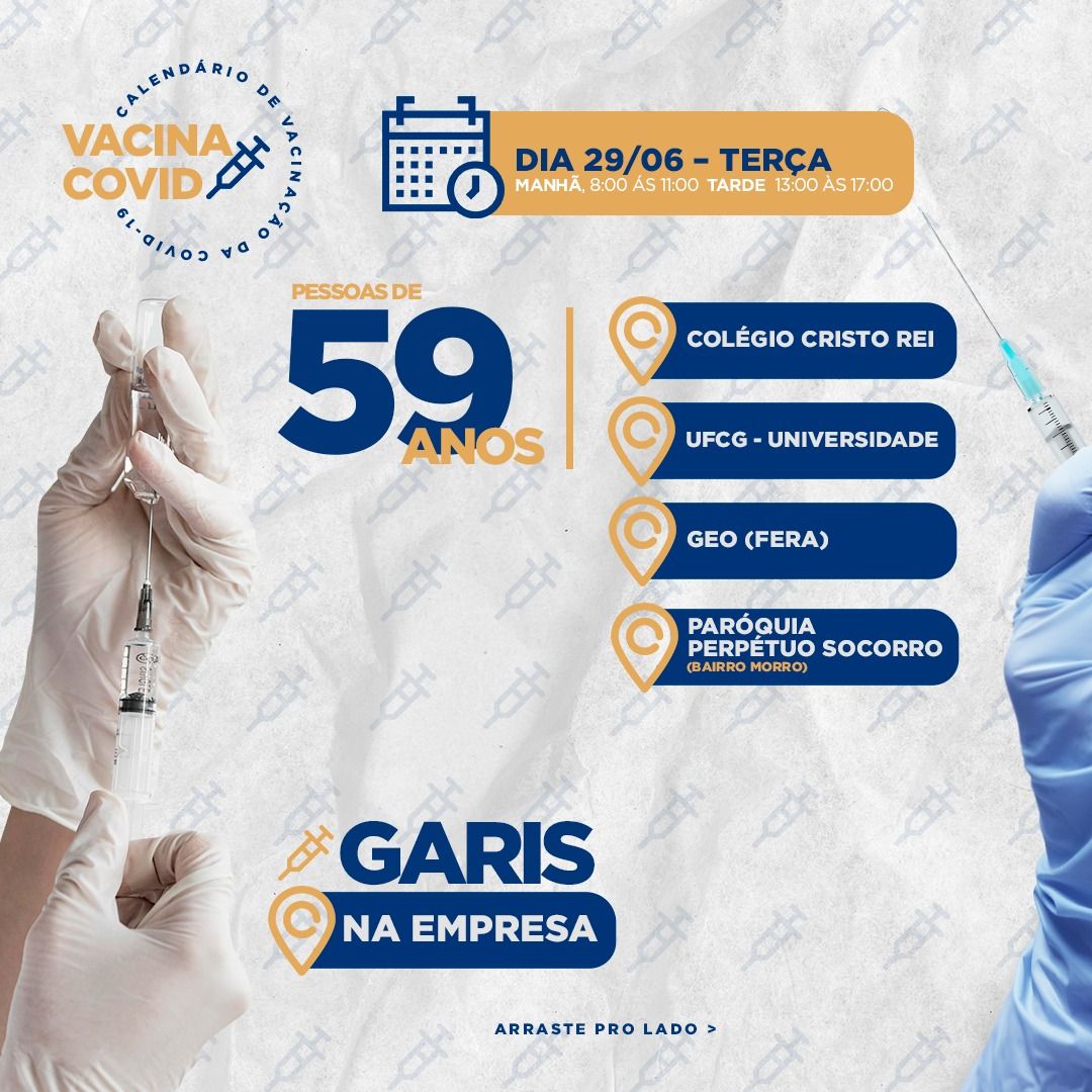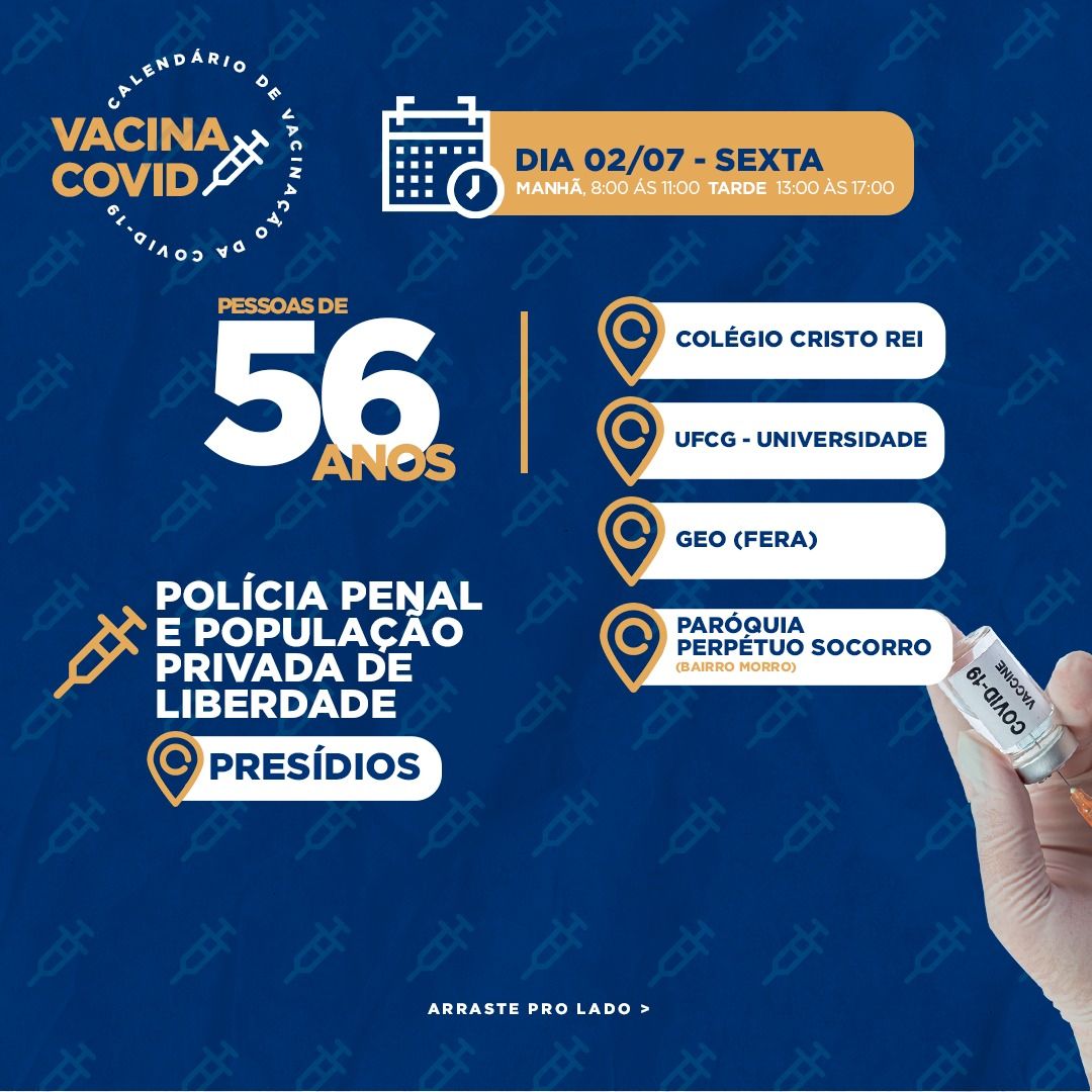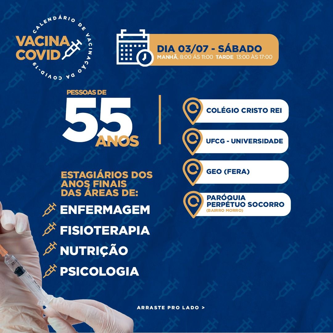 As pessoas de 55 a 59 anos, e que fazem parte dos profissionais do ensino superior e estagiários, serão imunizadas nos locais como Colégio Cristo Rei, UFCG, Colégio GEO e na Paróquia de Nossa Senhora do Perpétuo Socorro, no bairro Morro.