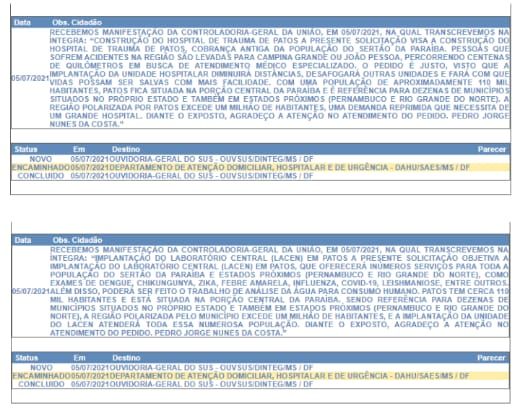 Através da plataforma Fala.BR, a Presidência da República encaminhou as demandas do jovem para o Ministério da Saúde. “Estou aguardando uma resposta e acredito que ela pode demorar. Não estou fazendo para ter algum ganho pessoal, mas porque como cidadão patoense, não me sinto bem representado pela classe política de Patos”, disse o jovem.