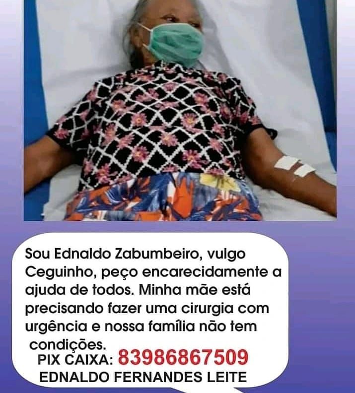 De acordo com Ednaldo Zabumbeiro, filho de Dona Maria, o procedimento chamado mega de esôfago custa mais R$ 3.500,00 em cada diária no Hospital Samaritano da capital, e não foi conseguido por meio do SUS, após procurar a Secretaria de Saúde de Patos.