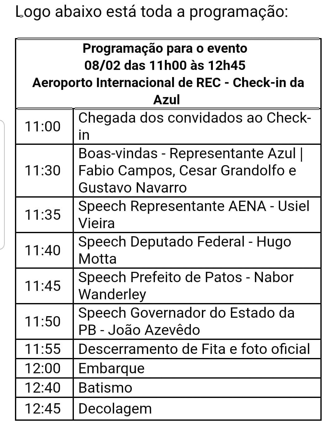 A previsão de saída do Recife é a partir das 12h45 do domingo, 8 de agosto, depois de um batismo oficial da aeronave. Estarão presentes o governador da Paraíba, João Azevêdo; o prefeito de Patos, Nabor Wanderley; o deputado Federal Hugo Motta, e os executivos de Relações Institucionais da Azul Fábio Campos, César Grandolfo e Gustavo Navarro. Antes do embarque, haverá uma breve solenidade no saguão do Aeroporto do Recife, na área de check-in da Azul, com a participação do gerente de Operações do aeroporto, Usiel Vieira.