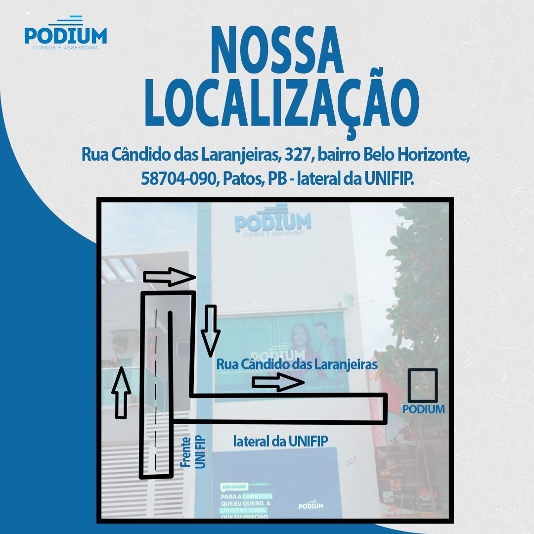 A PODIUM está pronta para auxiliar no seu sucesso, dispondo de qualificada equipe de professores, salas de aulas climatizadas, recursos audiovisuais, material didático (digital e impresso) e simulados, tudo isso com um valor bem acessível.