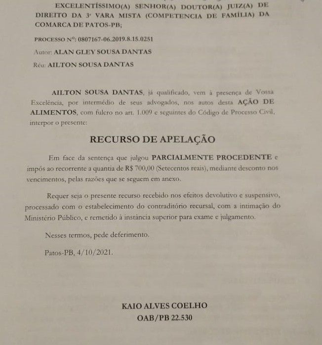 Alan finalizou dizendo que o recurso apresentado por seu pai será encaminhado ao Tribunal de Justiça da Paraíba-TJPB, mas espera um resultado positico do processo.
