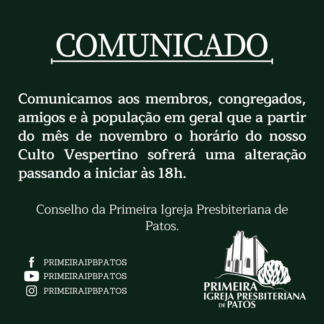 O conselho da Primeira Igreja Presbiteriana de Patos comunica aos membros, congregados, amigos e à população em geral, a mudança no horário do culto vespertino, que a partir do mês de novembro passará a iniciar às 18:00 horas.