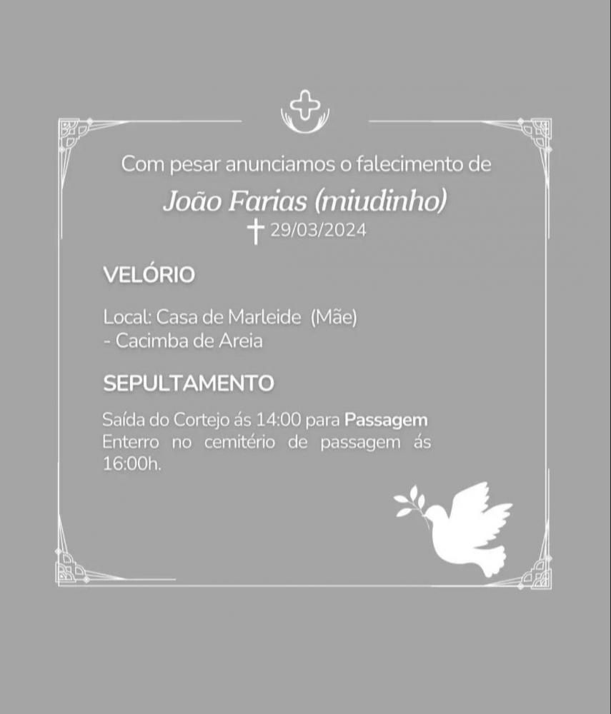 O velório está sendo realizado na residência de sua mãe, situada em Cacimba de Areia. Às 14h, o corpo seguirá em cortejo até a cidade de Passagem, onde será sepultado às 16h, no Cemitério Municipal.