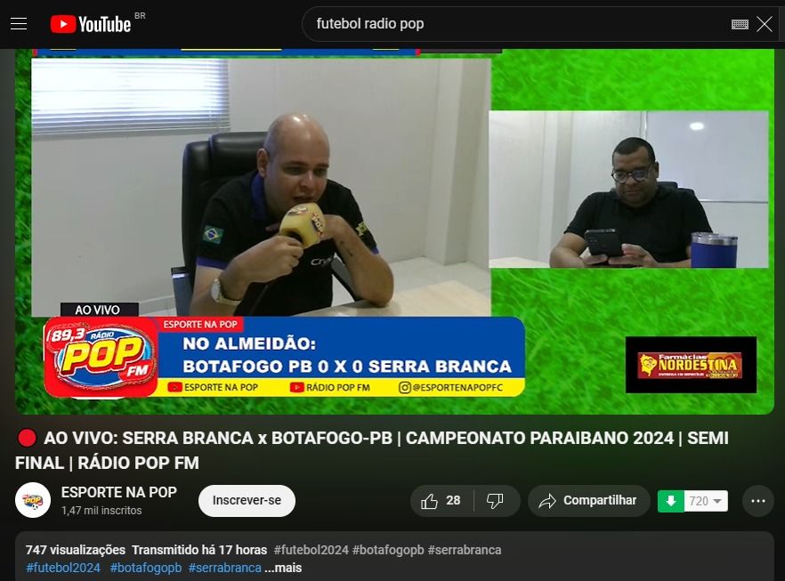 Rádio Tabajara lidera audiência no YouTube na classificação do Botafogo para a final do Paraibano 2024