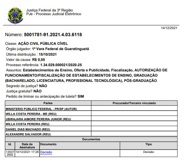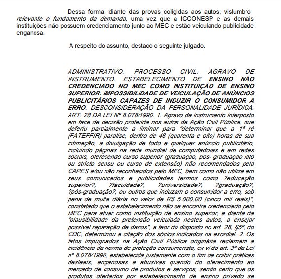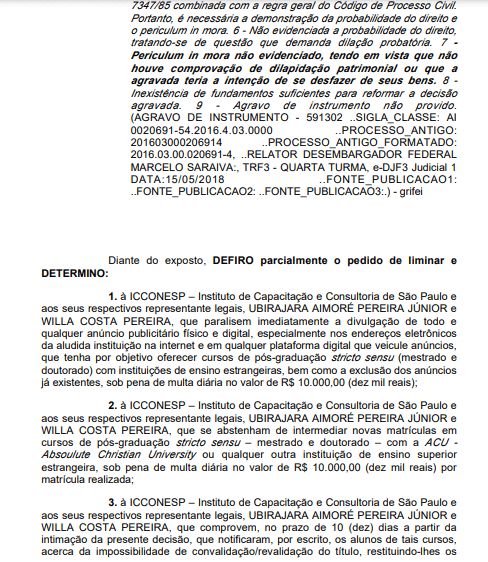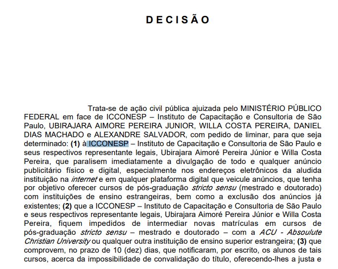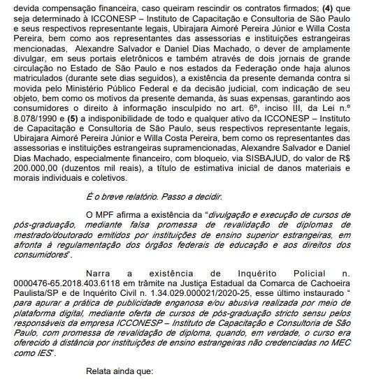 A instituição em questão é o Instituto de Capacitação e Consultoria de São Paulo (ICCONESP), que foi proibido pela justiça de realizar novas matrículas em cursos de pós-graduação stricto sensu (mestrado e doutorado). Esta proibição resulta de uma ação movida pelo Ministério Público de São Paulo, sob o número 5001781-91.2021.4.03.6118, datada de 2021.