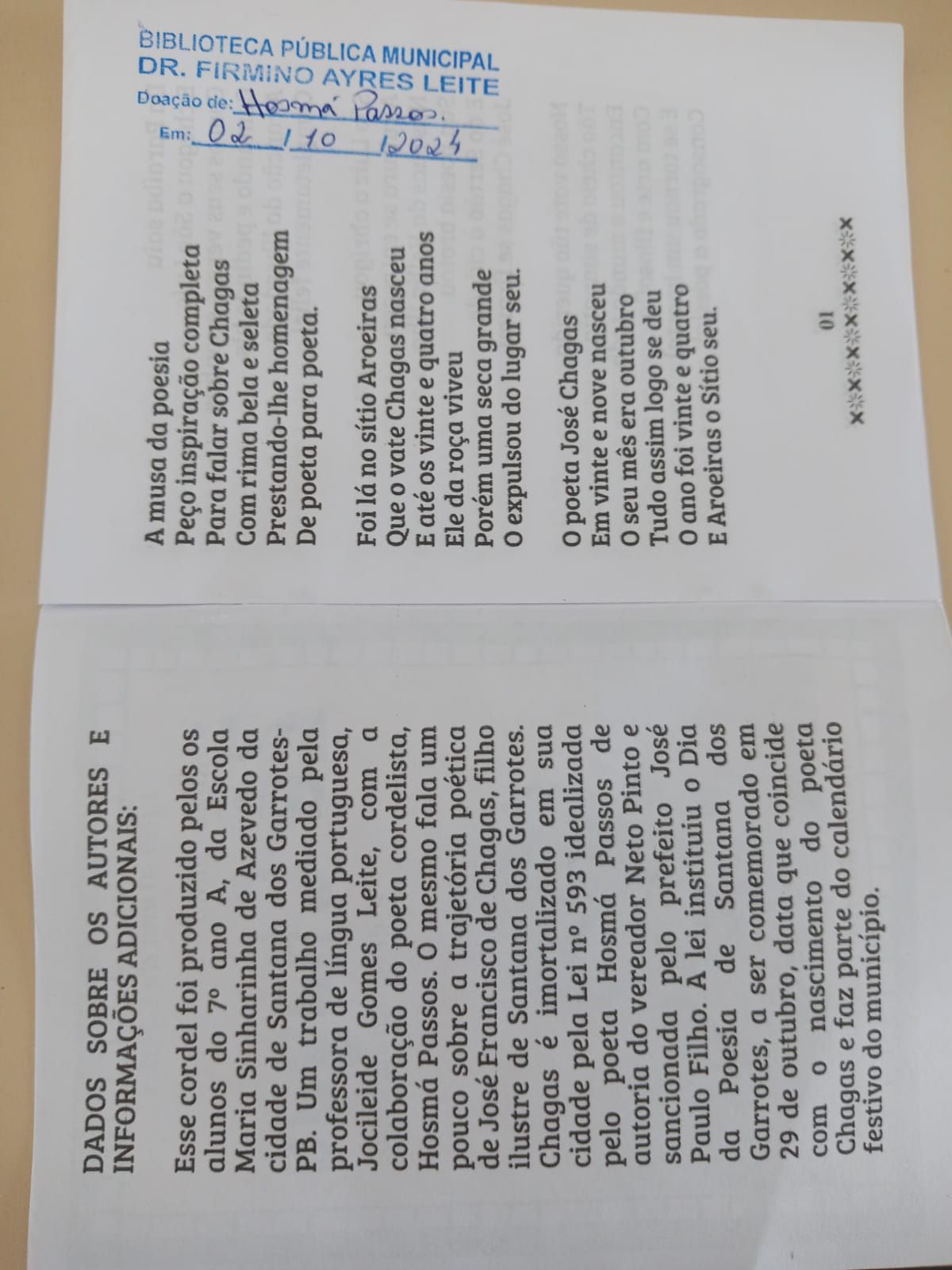 O poeta Hosmá Passos faz doação de cordéis produzidos por alunos do 7° ano da Escola Maria Sinharinha de Azevedo de Santana dos Garrotes à Biblioteca Municipal de Piancó - PB.