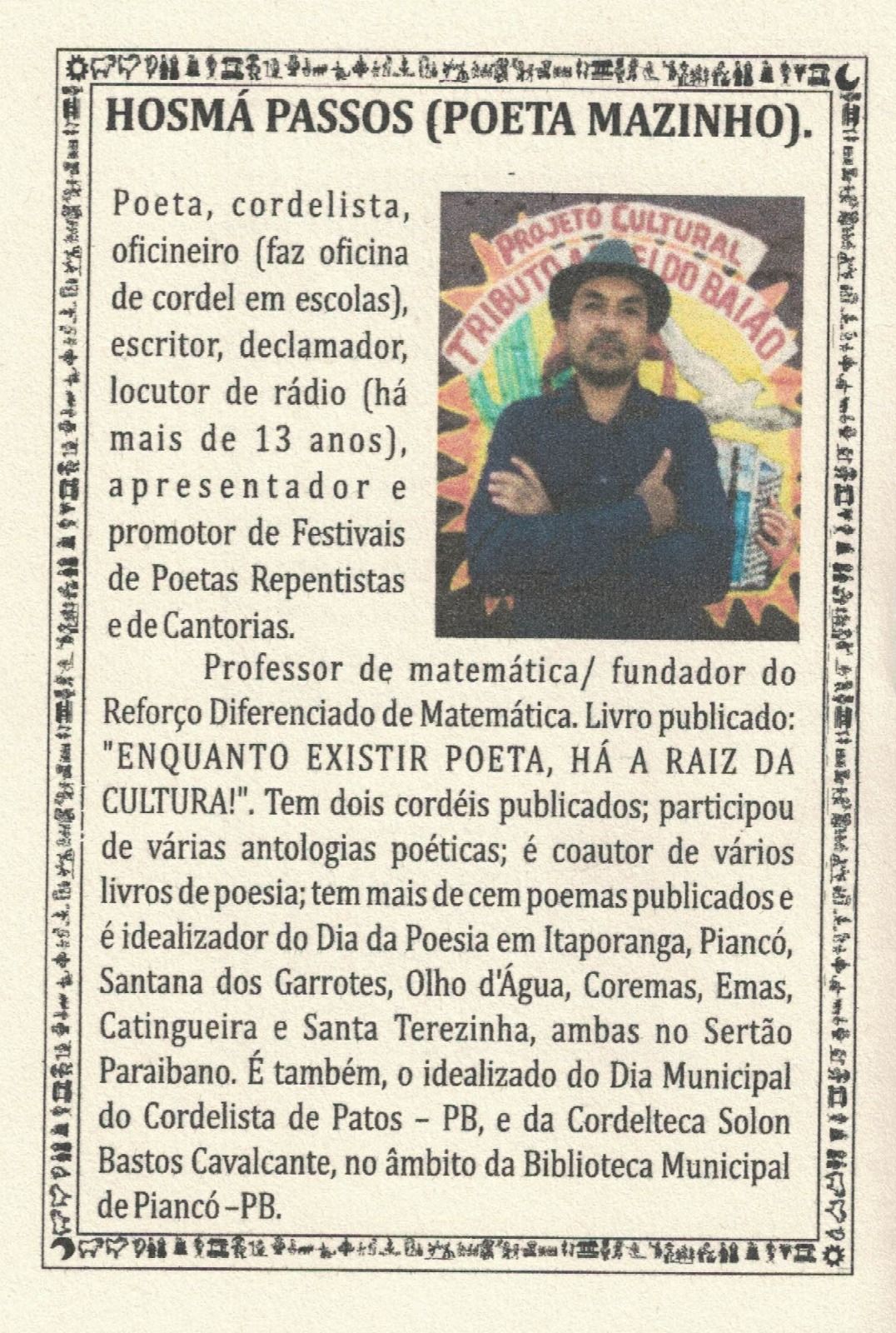 Poeta, cordelista, oficineiro (faz oficina de cordel em escolas), escritor, declamador, locutor de rádio (há mais de 13 anos), apresentador e promotor de Festivais de Poetas Repentistas e de Cantorias. Professor de matemática/ fundador do Reforço Diferenciado de Matemática. Livro publicado: "ENQUANTO EXISTIR POETA, HÁ A RAIZ DA CULTURA!". Tem dois cordéis publicados; participou de várias antologias poéticas; é coautor de vários livros de poesia; tem mais de cem poemas publicados e é idealizador do Dia da Poesia em Itaporanga, Piancó, Santana dos Garrotes, Olho d’Água, Coremas, Emas, Catingueira e Santa Terezinha, ambas no Sertão Paraibano. É também, o idealizado do Dia Municipal do Cordelista de Patos – PB, e da Cordelteca Solon Bastos Cavalcante, no âmbito da Biblioteca Municipal de Piancó –PB.