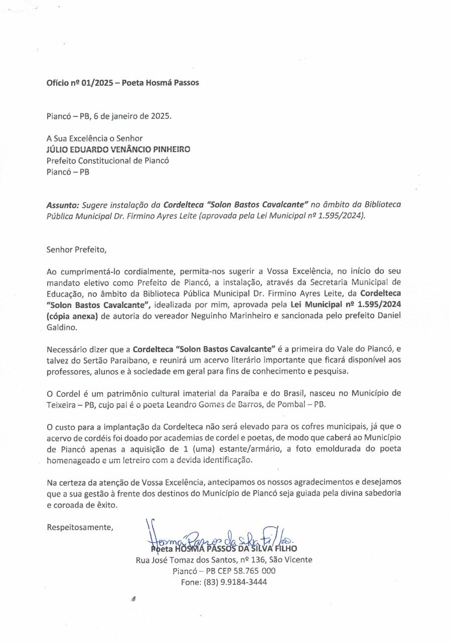No ofício 01/2025, o poeta Hosmá Passos sugere ao prefeito Júlio Eduardo a instalação da Cordelteca Solon Bastos Cavalcante no âmbito da Biblioteca Municipal de Piancó, Doutor-Poeta Firmino Aires Leite.