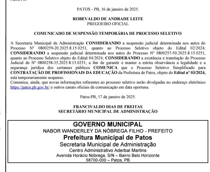 A Prefeitura de Patos, no Sertão paraibano, decidiu suspender os processos seletivos simplificados destinados ao preenchimento de vagas na Secretaria de Educação, Secretaria de Saúde e outros setores da administração municipal. A medida foi anunciada nesta segunda-feira, 20 de janeiro, pela Secretaria de Administração, que justificou a decisão como necessária para assegurar a legalidade e a segurança jurídica dos certames.