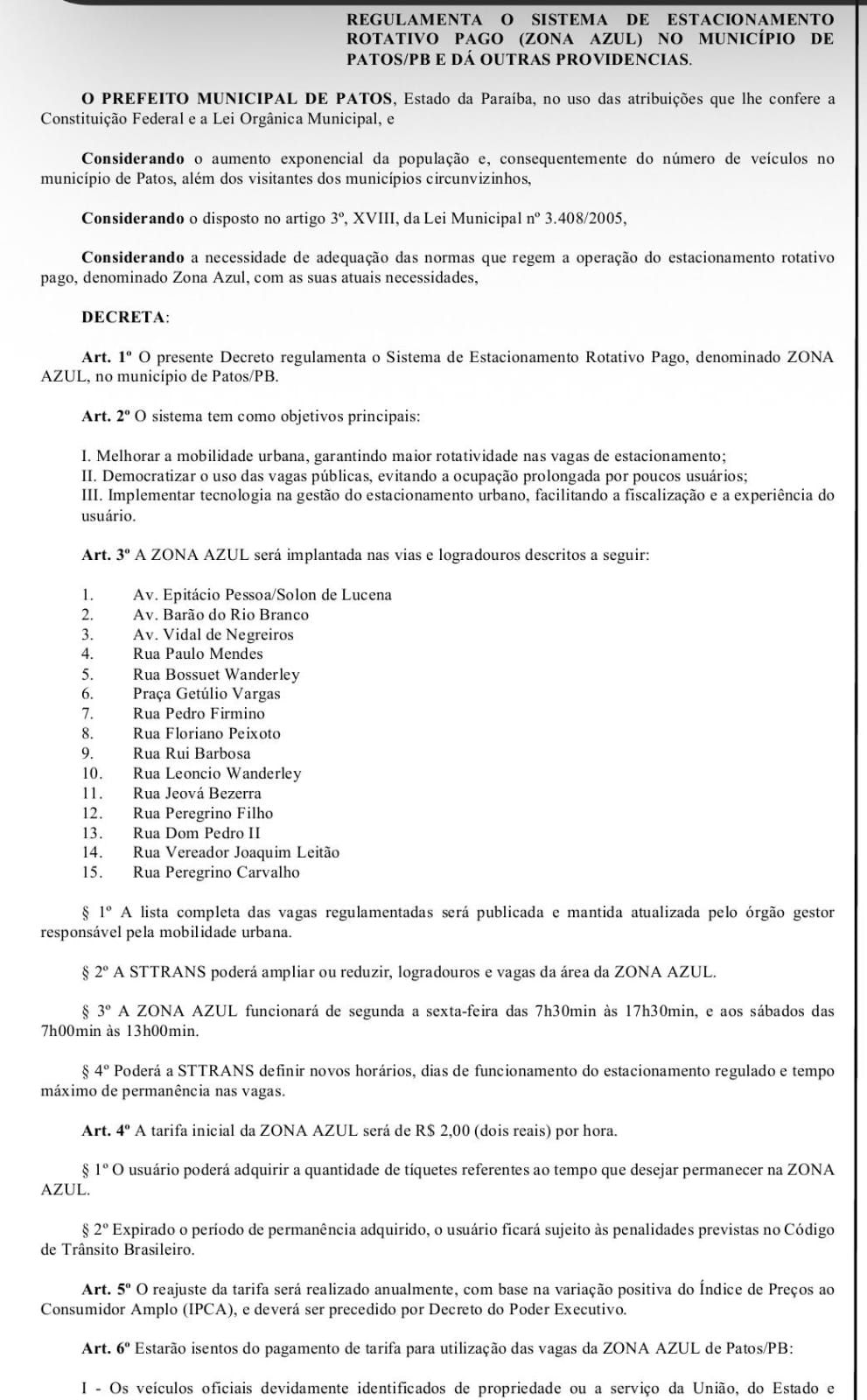 De acordo com o decreto, a Zona Azul será implantada nas principais vias do centro da cidade, entre elas: