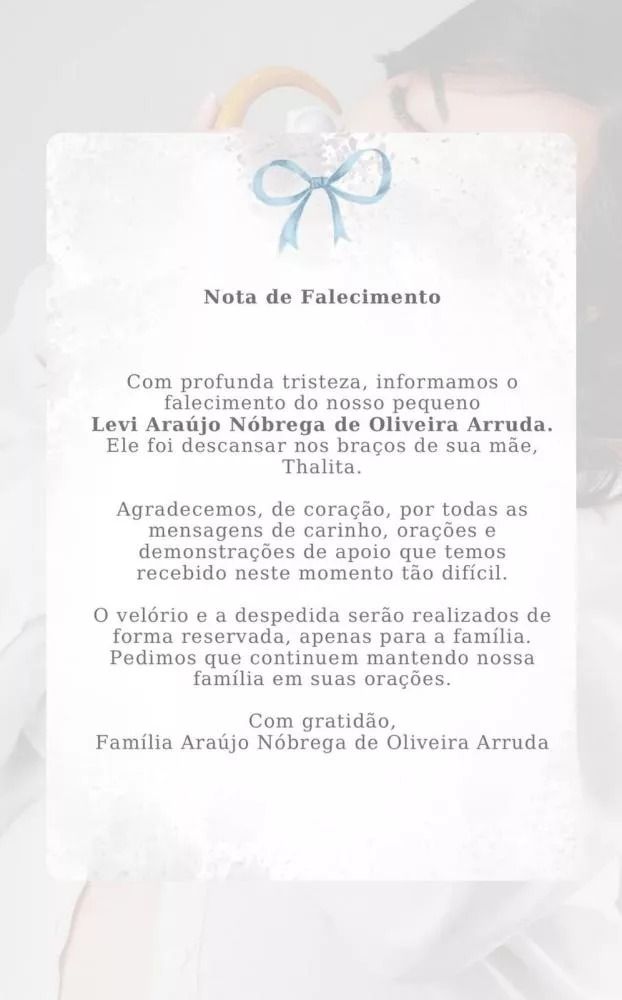 A família da empresária e bailarina Thalita Araújo Nóbrega, de 27 anos, confirmou, em nota oficial divulgada nesta segunda-feira (27), o falecimento do recém-nascido Levi Araújo Nóbrega de Oliveira Arruda, filho da artista campinense. O bebê estava internado na UTI Neonatal do Hospital Unimed, em Campina Grande, desde a última quarta-feira (22) — data em que Thalita faleceu após complicações durante o parto.