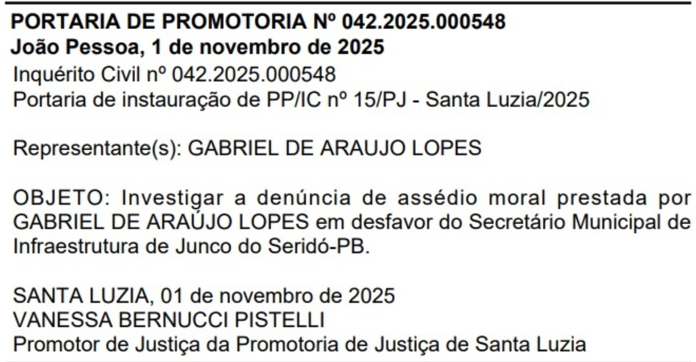 O Ministério Público da Paraíba (MPPB) abriu um Inquérito Civil para apurar uma denúncia de assédio moral envolvendo o secretário de Infraestrutura do município de Junco do Seridó. A investigação foi instaurada pela promotora de Justiça Vanessa Bernucci Pistelli, da Promotoria de Santa Luzia, e publicada oficialmente em 1º de novembro de 2025, sob o número 042.2025.000548.