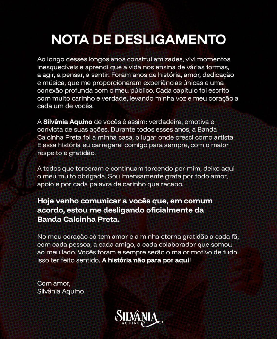 A cantora Silvânia Aquino anunciou nesta terça-feira, 11 de novembro, seu desligamento oficial da Banda Calcinha Preta, grupo do qual foi uma das principais vozes e figuras marcantes ao longo dos anos. O comunicado foi feito por meio de uma nota publicada nas redes sociais da artista.