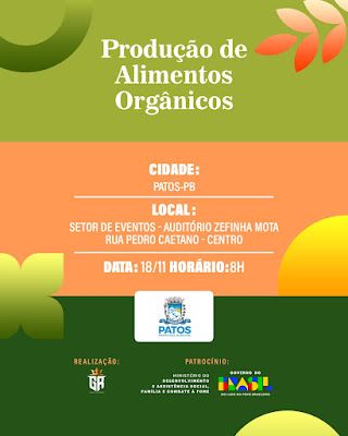 A cidade de Patos será a primeira de quatro cidades do sertão da Paraíba a sediar a oficina “Produção de Alimentos Orgânicos", o principal objetivo é orientar e incentivar os produtores locais sobre a participação nas chamadas públicas para se tornar potenciais produtores de alimentos destinados a merenda escolar, isso fortalecerá a agricultura familiar e promoverá geração de renda e segurança alimentar.O evento acontecerá terça-feira 18, no auditório da antiga Secretaria de Educação de Patos, antigo FECMMA, rua Pedro Caetano, centro de Patos, das 08h ao meio dia.