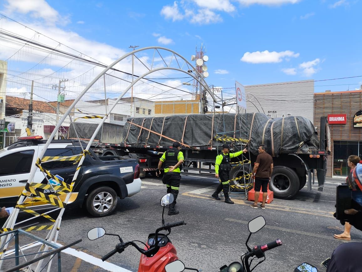 Jordan Bezerra acompanhou de perto o momento do ocorrido, a carreta acabou se entrelaçando na estrutura de enfeites montada pela Prefeitura para o período natalino. A situação, que inicialmente parecia simples de resolver, rapidamente tomou proporções maiores, exigindo a intervenção da equipe do STTRANS, responsável pelo ordenamento do trânsito local.