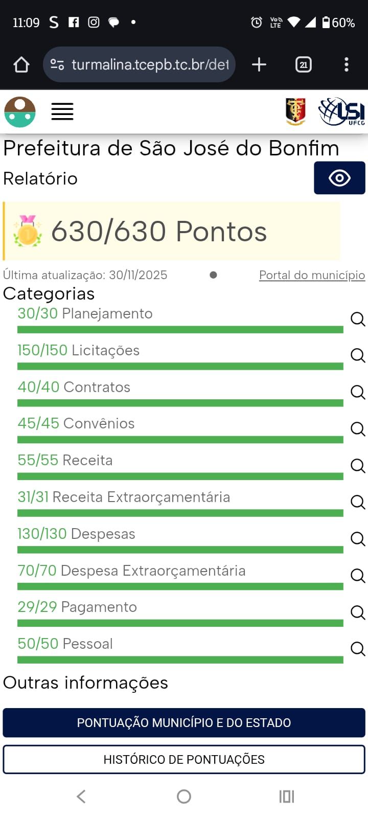 Em atualização do Ranking Estadual de Transparência divulgado pelo portal turmalina.tcepb no último dia 30 de novembro de 2025, o município de São José do Bonfim aparece em primeiro lugar na avaliação de todas as categorias analisadas pelo relatório de Transparência de Gestão do TCE( Tribunal de Contas do Estado).