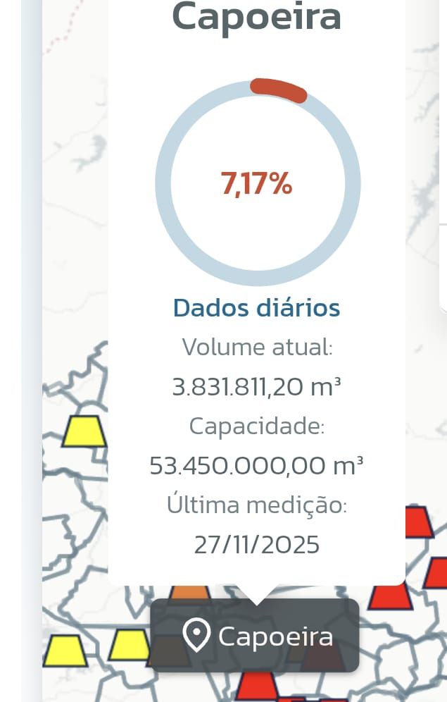 A última atualização disponível no sistema da AESA data de 27 de novembro. Nesta quinta-feira, 18 de dezembro, já se passaram mais de 20 dias sem a divulgação de novos números, o que impede a exatidão sobre o volume atual de água nos reservatórios, especialmente no Açude de Capoeira, cuja última medição aponta menos de 7%.