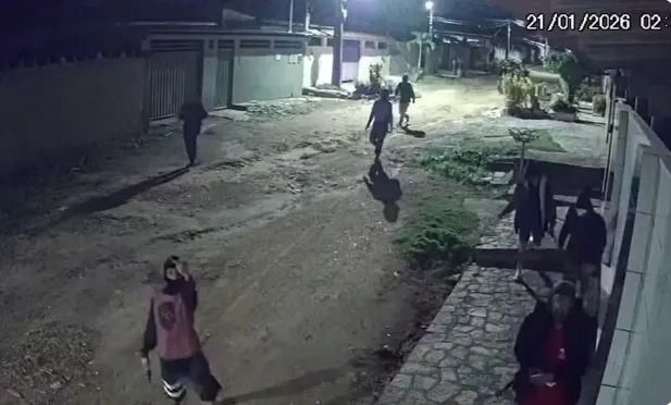 As imagens, registradas por volta das 2h37, mostram ao menos 18 homens circulando pelas ruas, fortemente armados, portando espingardas e revólveres. Parte do grupo aparece encapuzada, utilizando balaclavas, e alguns suspeitos chegam a fazer gestos obscenos em direção às câmeras.