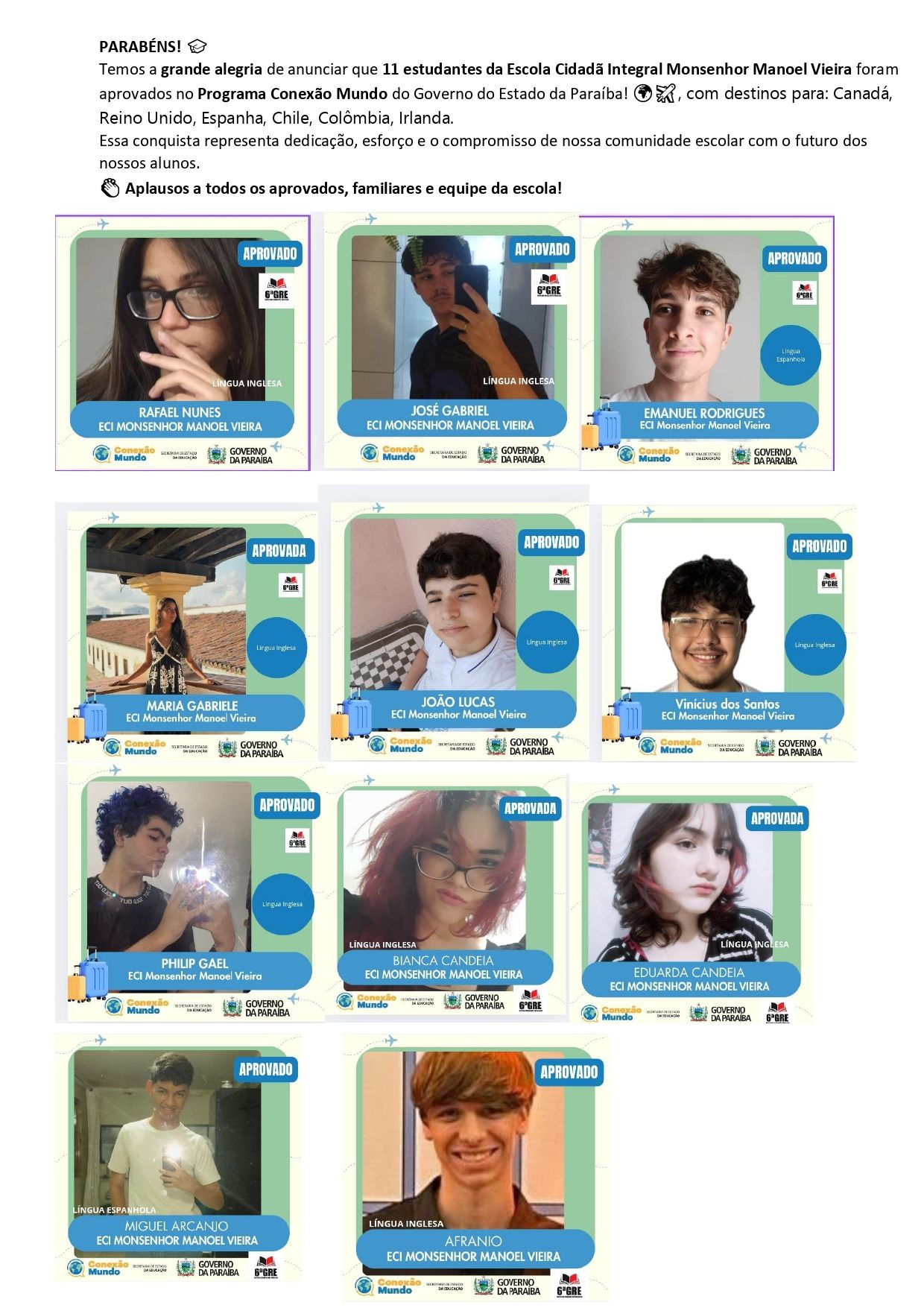 A educação pública de Patos, no Sertão da Paraíba, vive um momento histórico e motivo de grande orgulho. A Escola Cidadã Integral Monsenhor Manuel Vieira alcançou uma conquista expressiva: 11 estudantes foram aprovados no programa Conexão Mundo, iniciativa do Governo do Estado da Paraíba que oportuniza intercâmbio internacional para alunos da rede pública estadual.