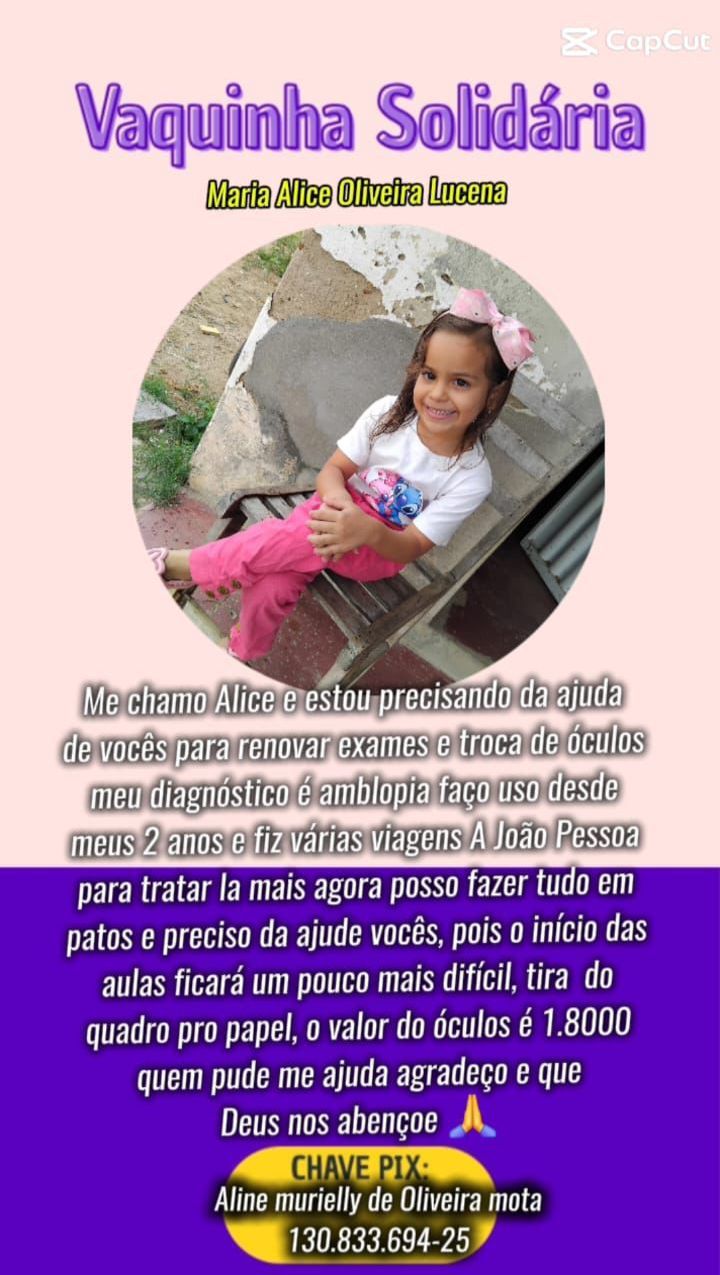 Uma campanha solidária está sendo realizada para ajudar a pequena Maria Alice Oliveira Lucena, moradora do município de Santa Terezinha, no Sertão paraibano. Diagnosticada com ambliopia, condição oftalmológica que compromete o desenvolvimento da visão, Alice faz uso de óculos desde os 2 anos de idade e necessita renovar exames e realizar a troca das lentes para dar continuidade ao tratamento.