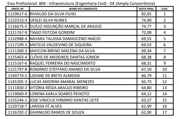 Entre os candidatos classificados, destaque para o patoense Rivaildo da Silva Filho, de 31 anos, que conquistou o primeiro lugar em ampla concorrência no eixo profissional de Infraestrutura (Engenharia Civil). Doutor em Engenharia Civil e professor, Rivaildo alcançou nota final de 82,65, resultado que tem sido motivo de orgulho para familiares e amigos, especialmente para sua mãe, Cleonice.