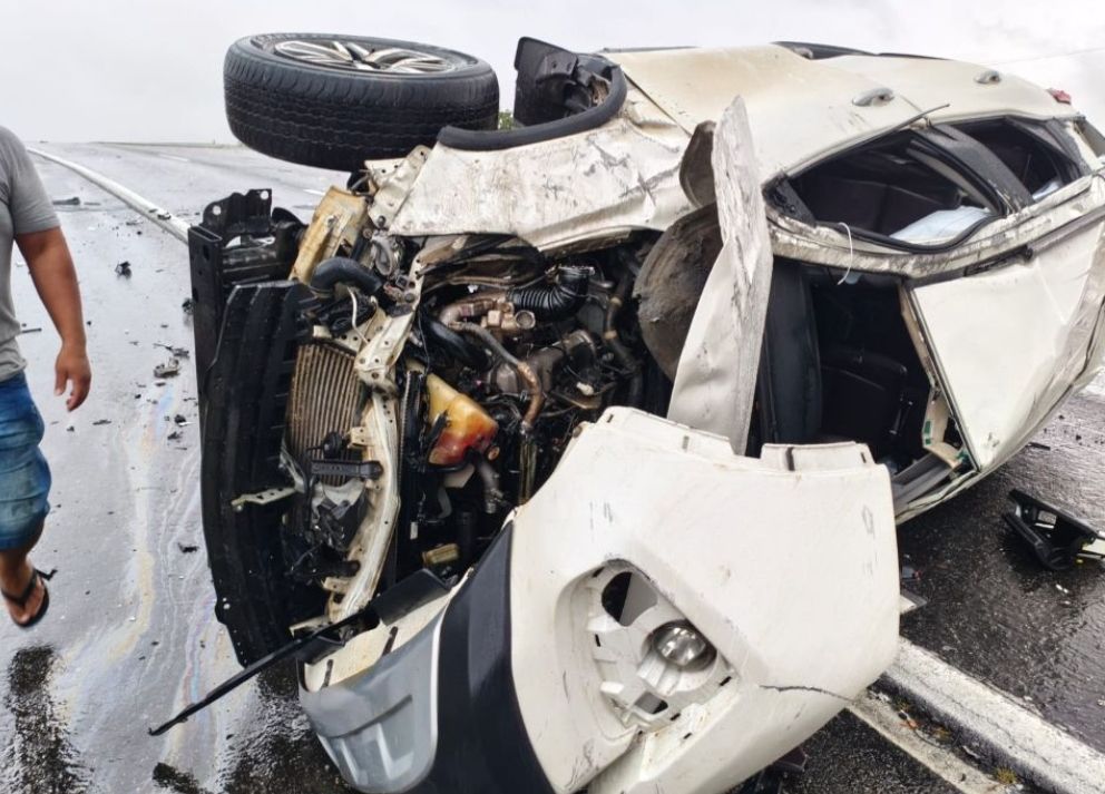 Com a pista molhada, o automóvel acabou saindo da trajetória e capotou várias vezes — estima-se que ao menos cinco tombos — até parar às margens da estrada.