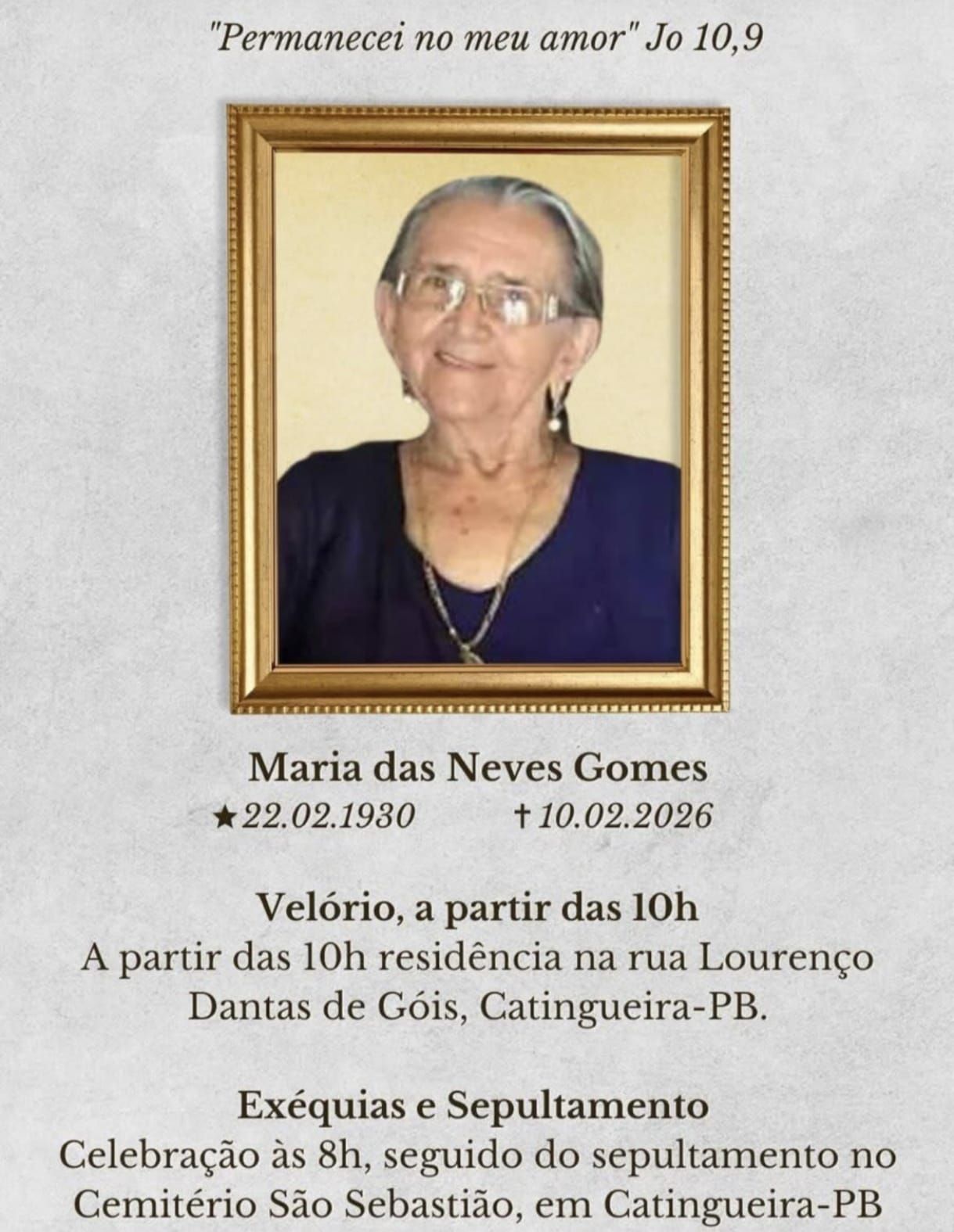 A cidade de Catingueira, no Sertão da Paraíba, amanheceu em clima de tristeza com a notícia do falecimento de Dona Maria das Neves Gomes, carinhosamente conhecida pela comunidade e lembrada como a avó de Gugu de Catingueira. Ela tinha 95 anos.
