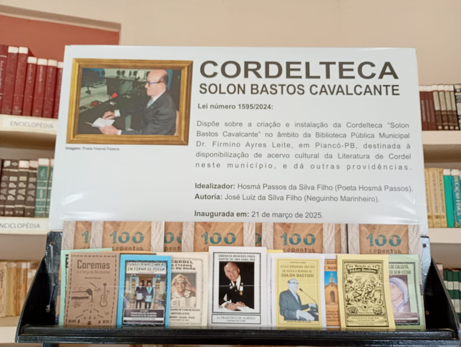 A Cordelteca Poeta Solon Bastos, integrada à Biblioteca Dr. Firmino Ayres Leite e localizada na Praça Agamenon Farias, em frente à E.E.C.I.T. Santo Antônio, em Piancó, retomou suas atividades às 8h desta quarta-feira, 12 de fevereiro de 2026. Na ocasião, o poeta Hosmá Passos doou o cordel Menção ao Folclore Brasileiro, de autoria de Solon Bastos, reforçando o compromisso do espaço com a valorização da literatura de cordel e da cultura popular brasileira.