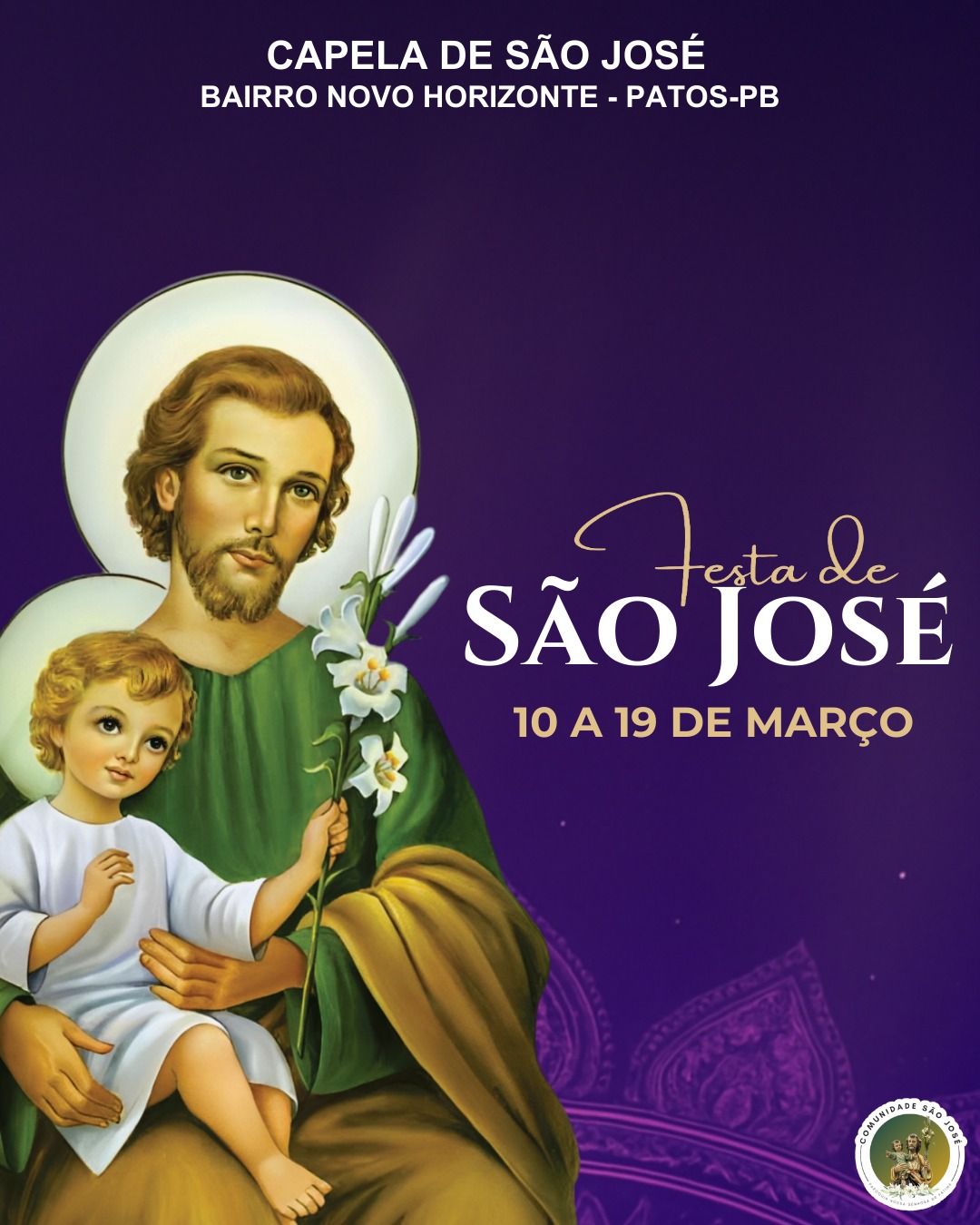 Terá início hoje às 19h, na comunidade Novo Horizonte, a festa de São José, com hasteamento da bandeira, e Missa de abertura com o padre Luiz Gonzaga.