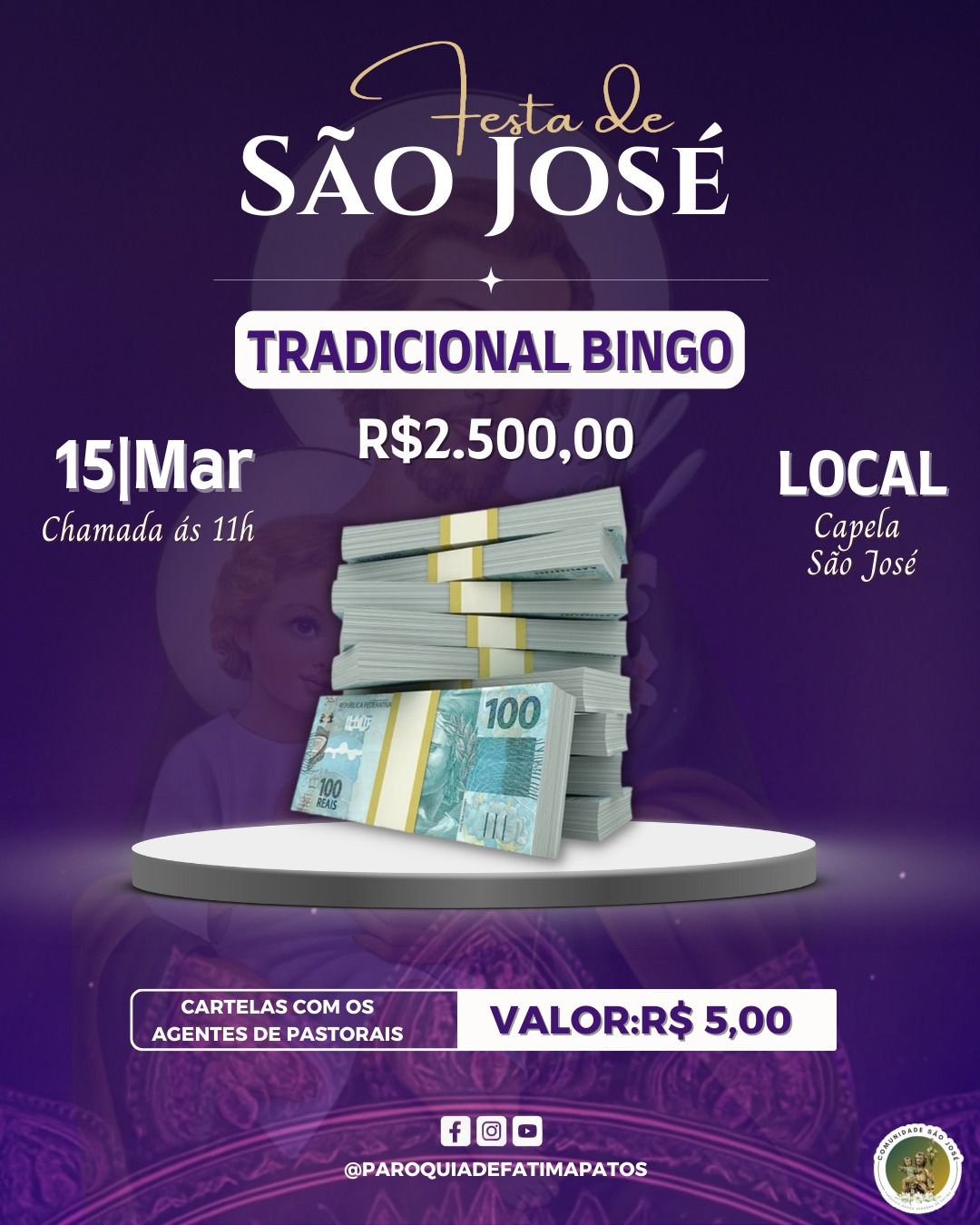 O objetivo financeiro da festa será a aquisição de bancos novos para a capela.Com o tema: " São José, exemplo de obediência, fidelidade e missão", e com a fundamentação bíblica " a perseverança silenciosa que cumpre as promessas divinas"(Mt 1,20-22), os devotos de São José são convidados para se "unirem em prece, oração e louvor a Deus pelas maravilhas que ele realiza em favor da Igreja e da humanidade, por intermédio do nosso amado padroeiro São José ", nos exorta o padre Luiz Gonzaga, administrador Paroquial da Paróquia de Nossa Senhora de Fátima.
