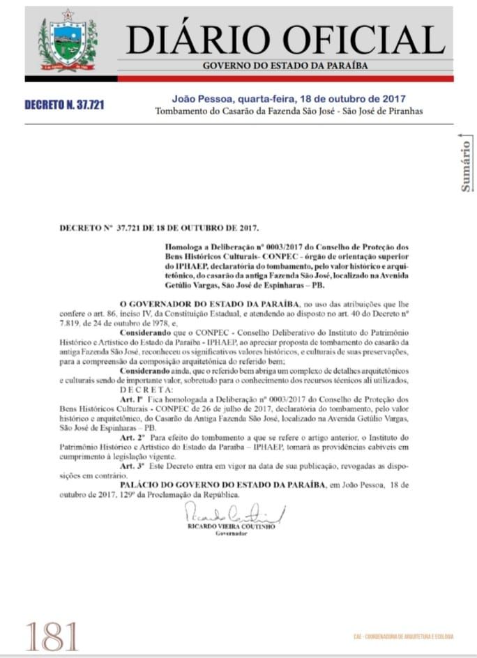 O valor histórico do casarão foi oficialmente reconhecido em 2017, quando o então governador Ricardo Coutinho assinou o decreto de tombamento, garantindo proteção legal ao imóvel por meio do Estado.