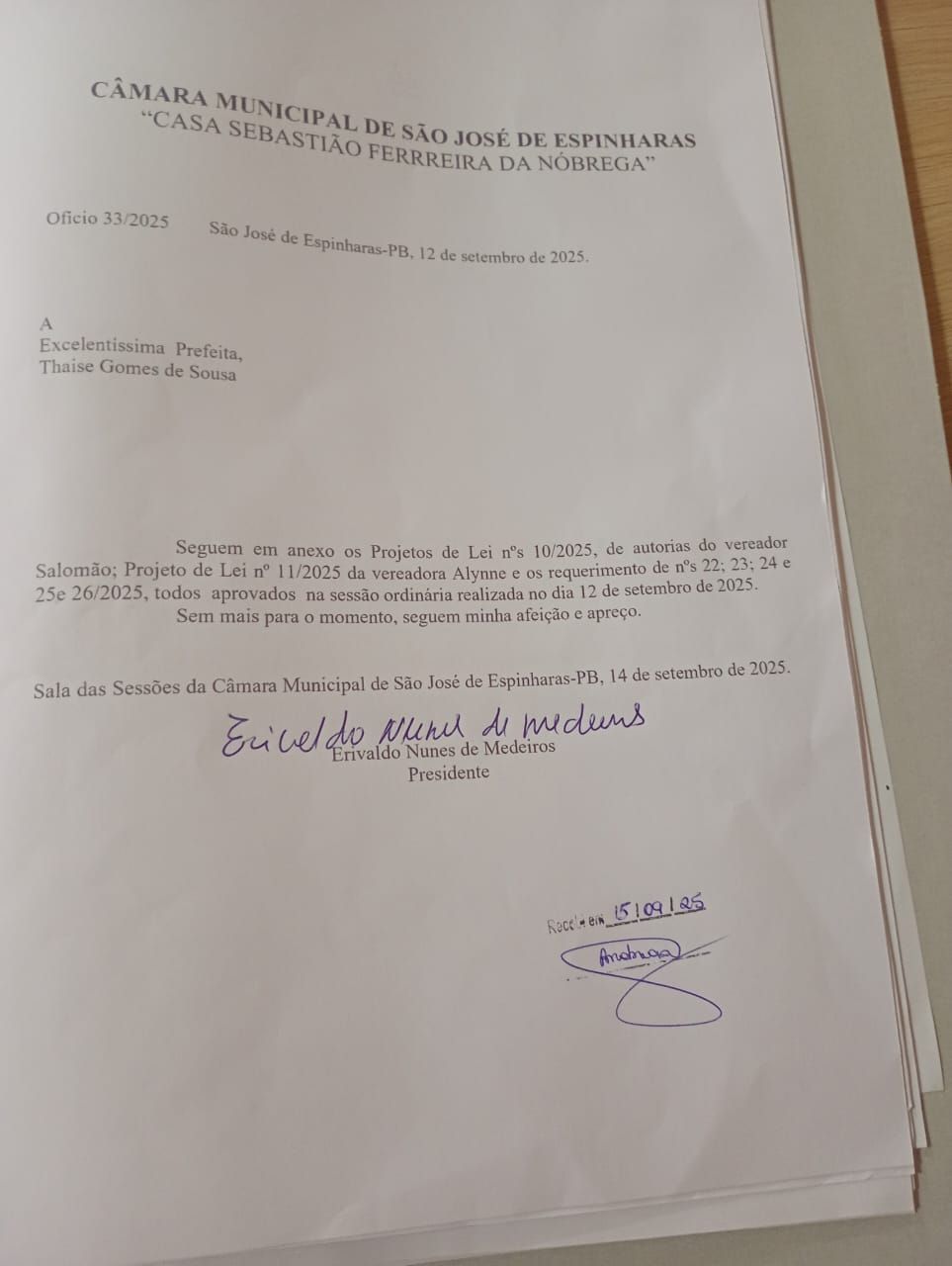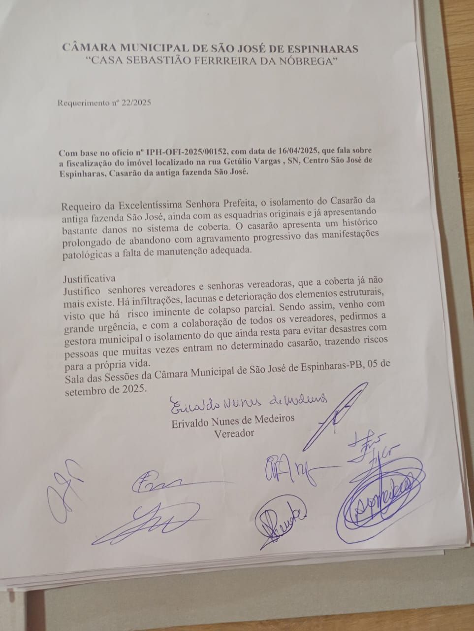 Mesmo após a emissão do documento, e de cobranças feitas pela Câmara Municipal de São José de Espinharas, não houve intervenções efetivas para recuperação do imóvel. Veja documentos emitidos pela Câmara Municipal: