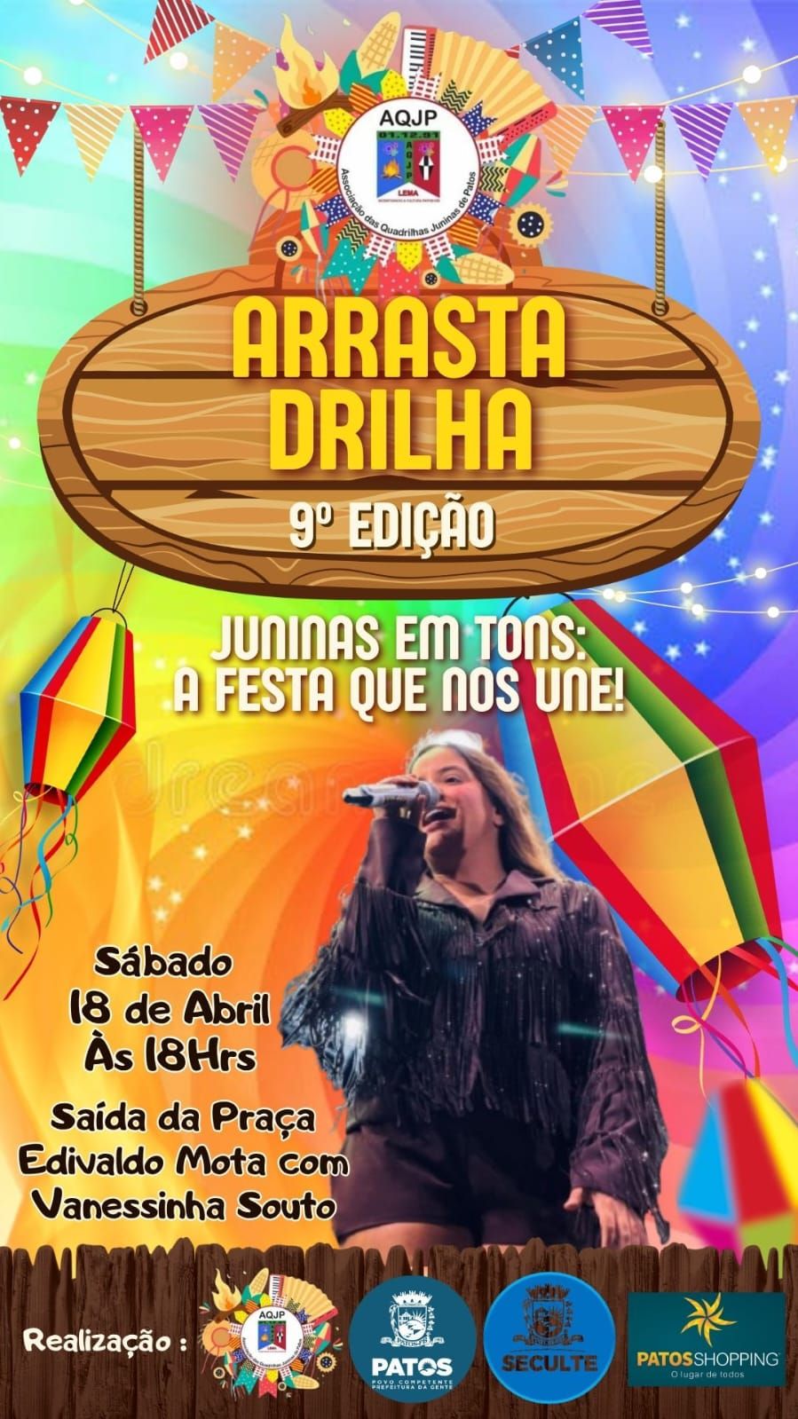 No dia 18 de abril, às 18h, a cidade de Patos iniciará o Calendário oficial dos festejos juninos com a realização da 9° edição do Arrasta Drilha. Com um novo formato, novo percurso, o evento é promovido pela Associação de Quadrilhas Juninas de Patos (AQJP), com o apoio da Prefeitura de Patos por meio da Secretaria de Cultura, Turismo e Esporte (SECULTE) e Patos Shopping.