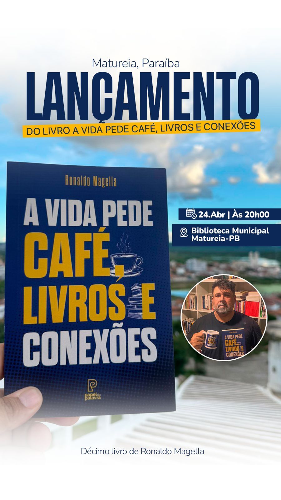 O escritor, professor e jornalista Ronaldo Magella celebrará mais um importante marco em sua trajetória literária no próximo dia 24 de abril, na cidade de Maturéia, no Sertão paraibano. Na ocasião, será realizado o lançamento de seu décimo livro, intitulado A vida pede café, livros e conexões, consolidando sua contribuição para a cultura e a literatura regional.